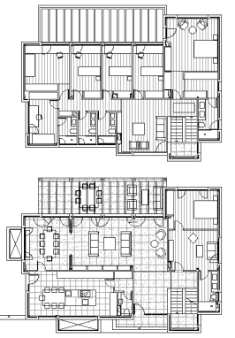 Todos los volúmenes van horadados por grandes huecos que forman las ventanas, buscando el equilibrio entre superficies cerradas y abiertas.