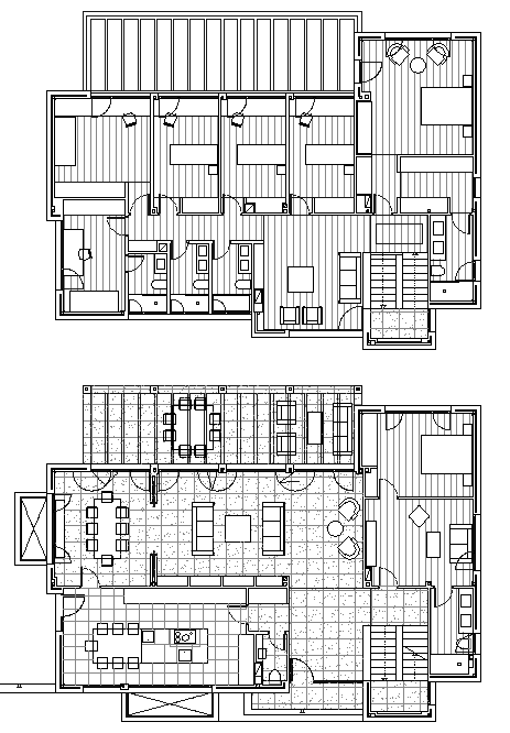 Todos los volúmenes van horadados por grandes huecos que forman las ventanas, buscando el equilibrio entre superficies cerradas y abiertas.